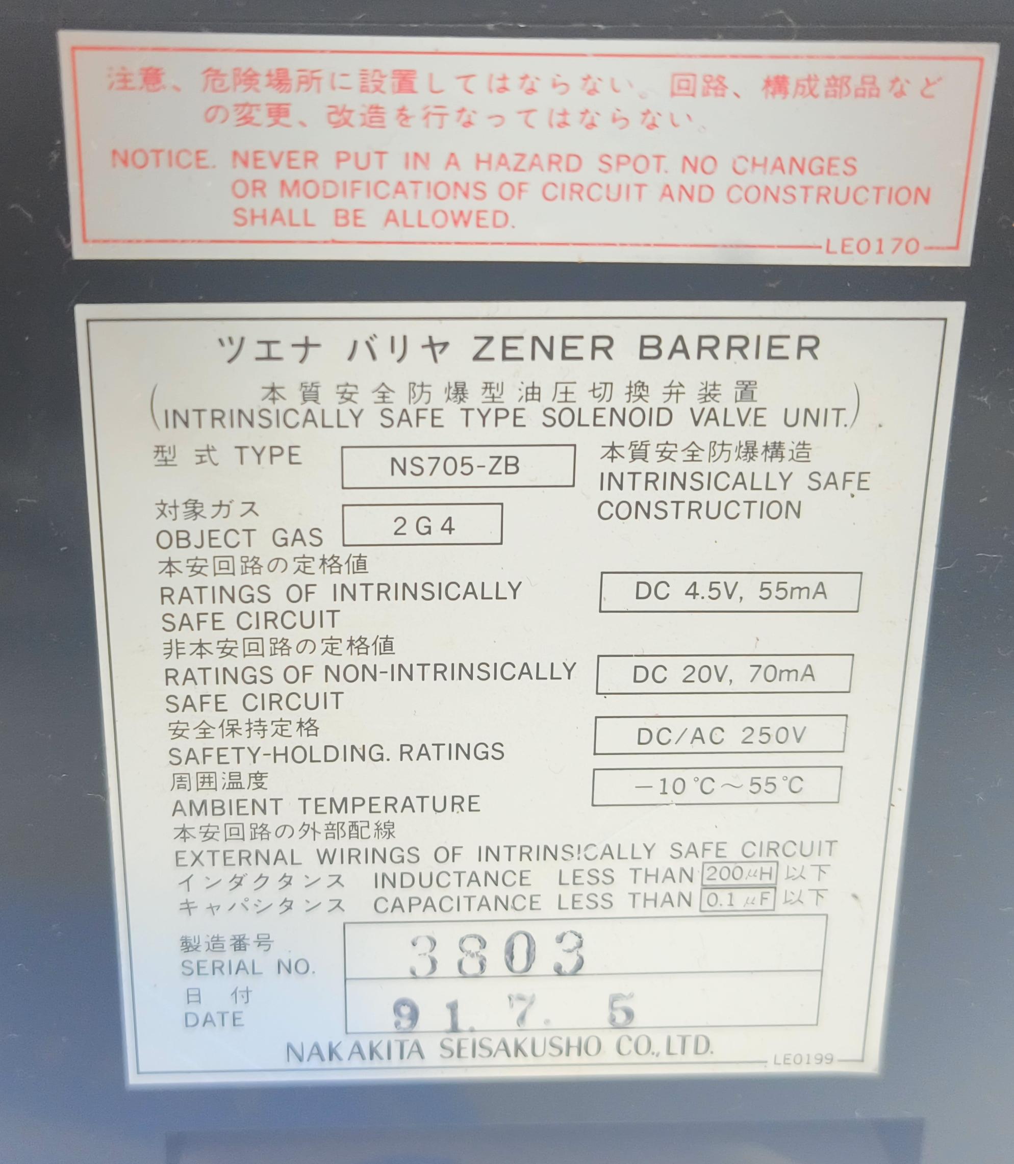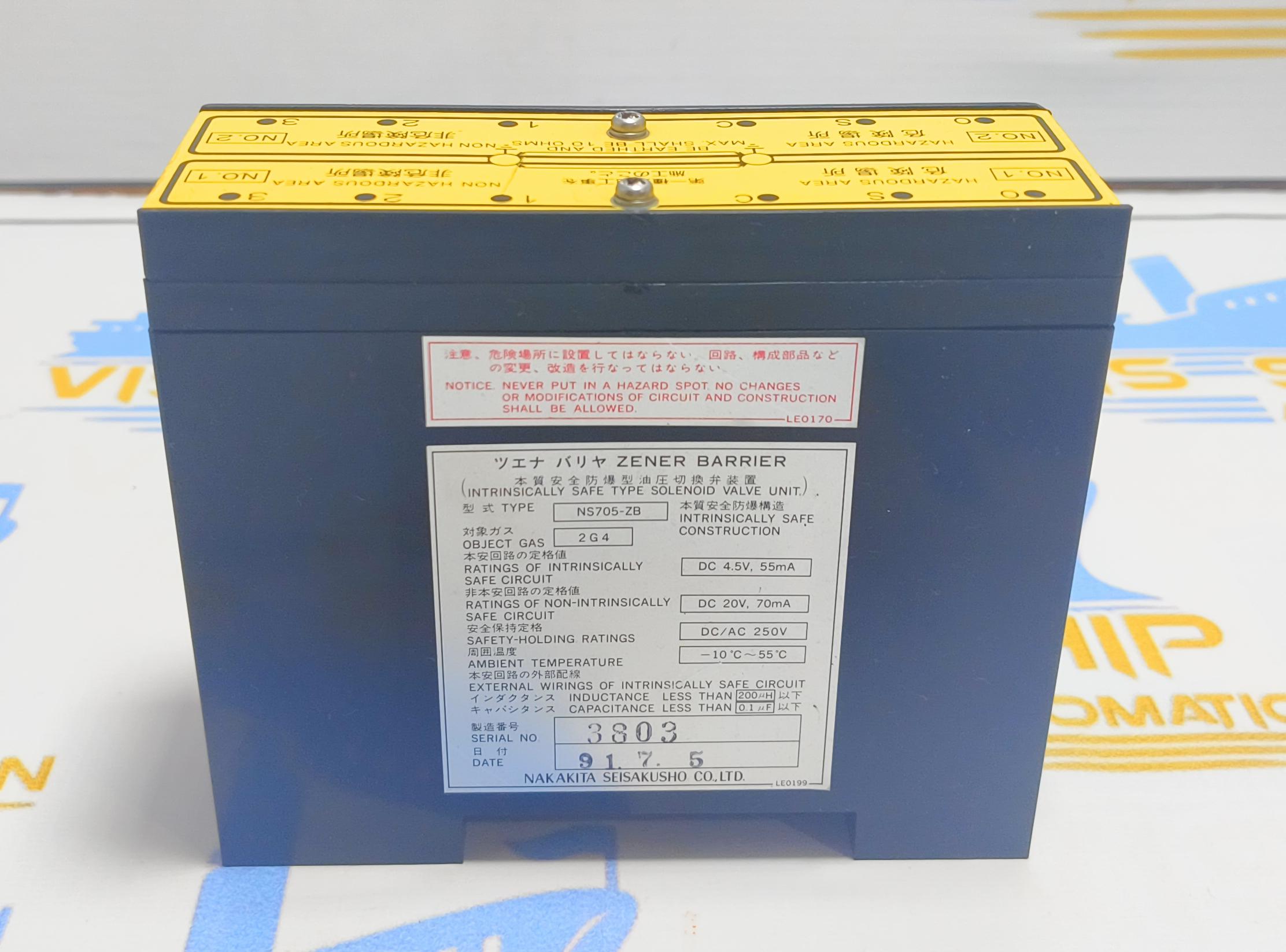 NAKAKITA SEISAKUSHO NS705-ZB INTRINSICALLY SAFE TYPE SOLENOID VALVE UNIT ZENER BARRIER SERIAL NO : 3803