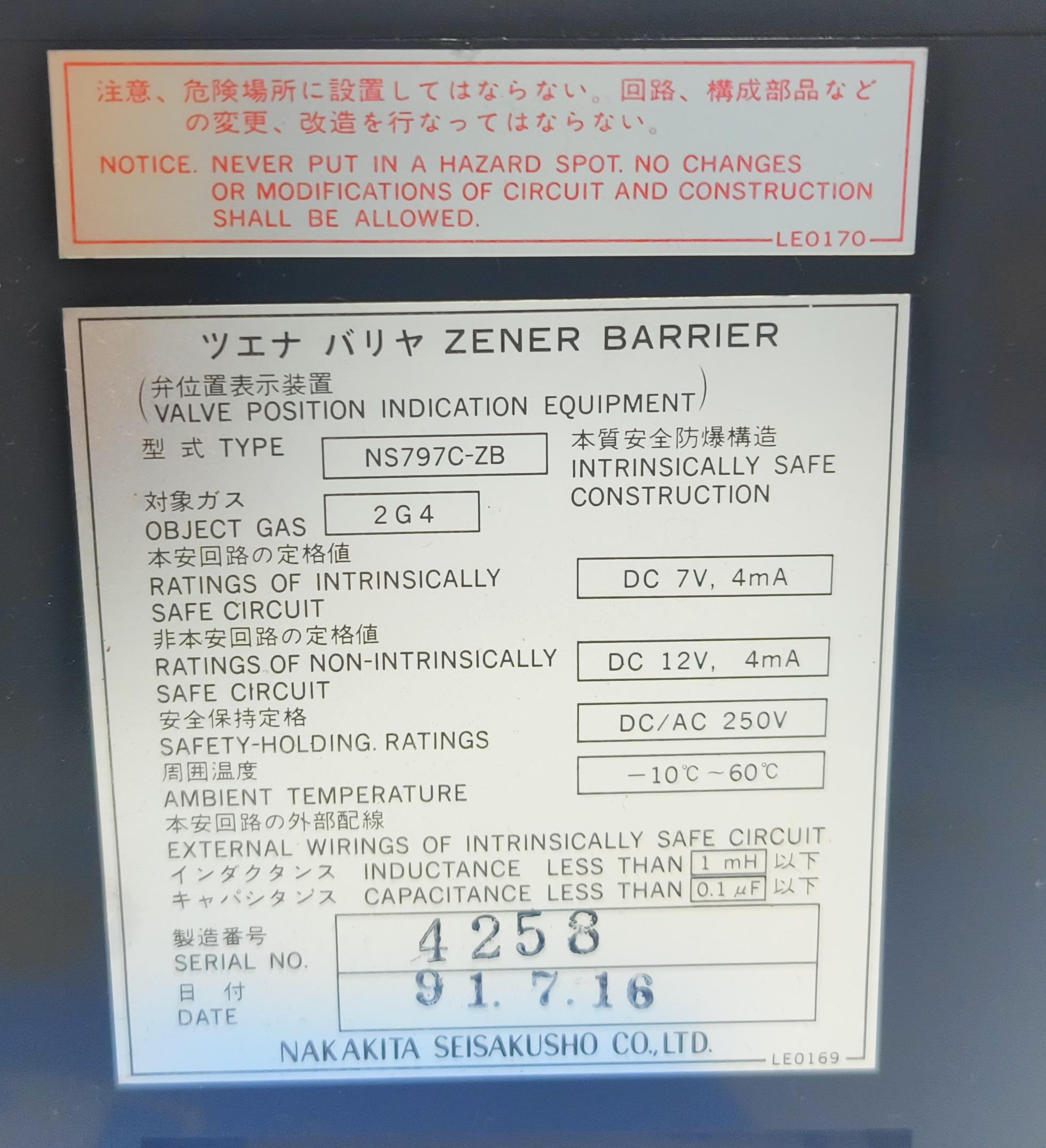 NAKAKITA SEISAKUSHO NS797C- ZB VALVE POSITION INDICATION EQUIPMENT ZENER BARRIER SERIAL NO : 4258