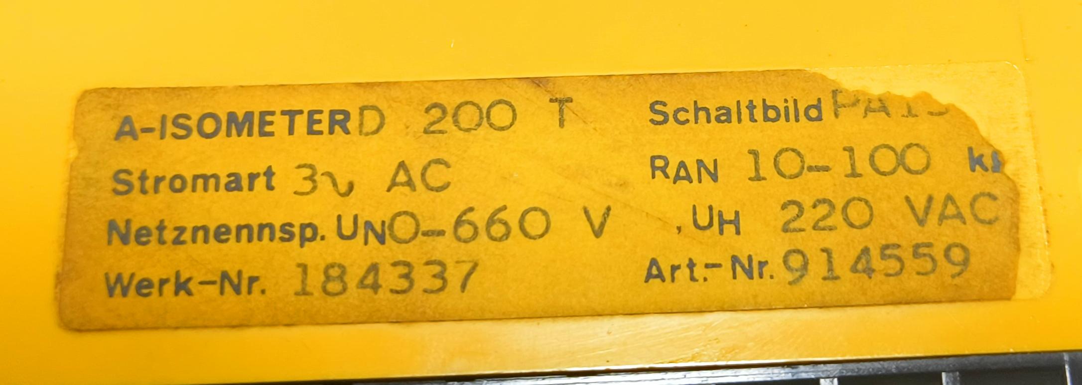 BENDER A-ISOMETER D200 Insulation Monitoring Device 0-660V, 50-400Hz WORK NO : 184337