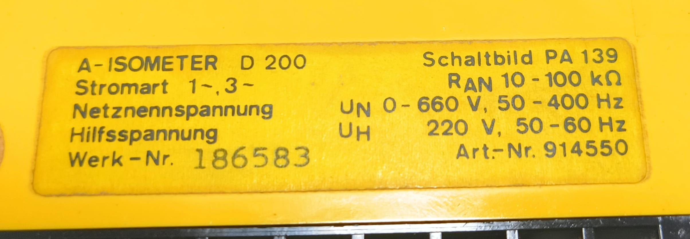 BENDER A-ISOMETER D200 Insulation Monitoring Device 0-660V, 50-400Hz WORK NO : 184337